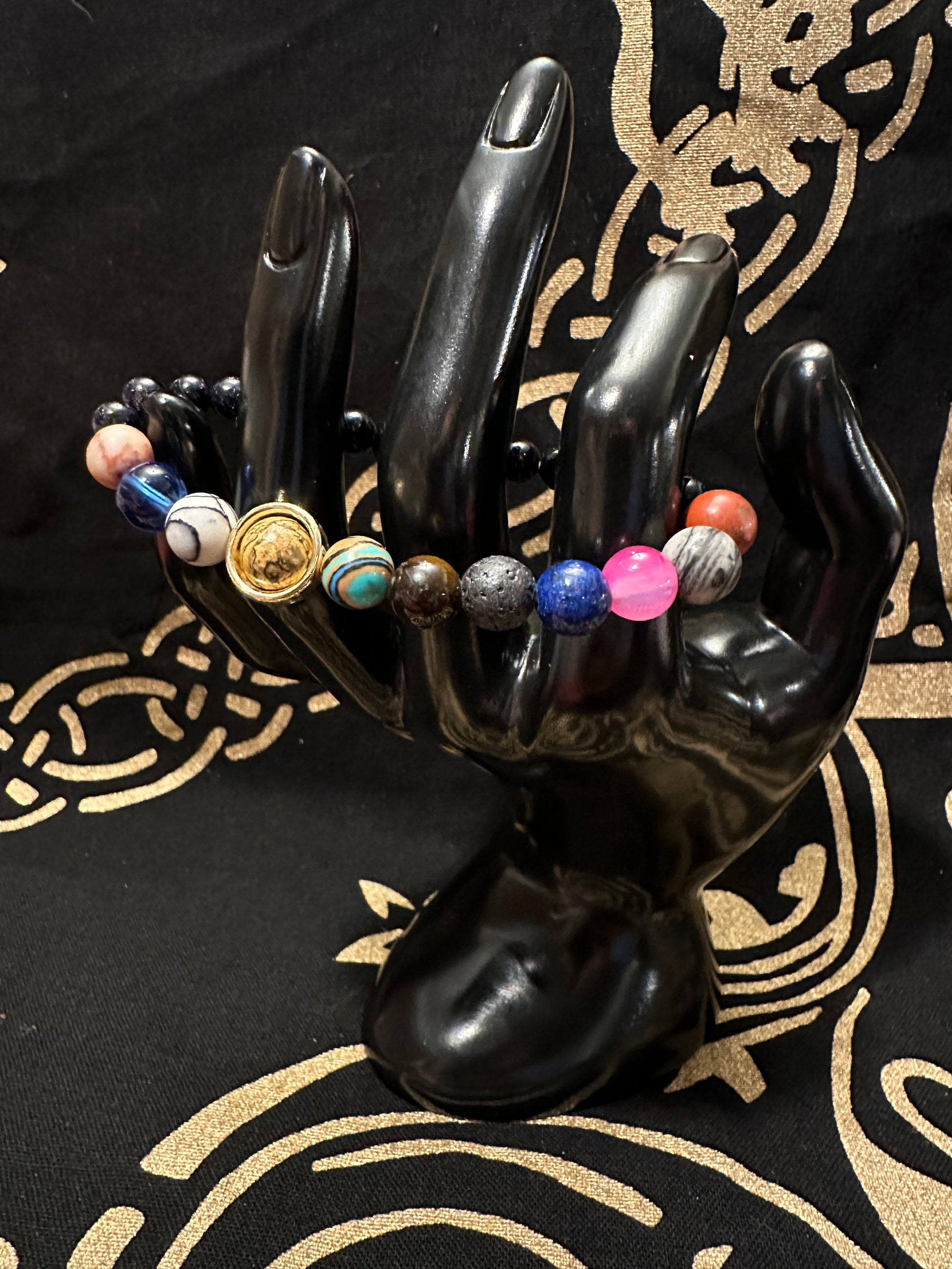 The Solar System Cosmic Bracelet, representing our planets (the ring around Saturn spins). Handmade Beaded Stretch Bracelet to fit all. Easy to wear, elasticated bracelet for easy on and off. Do not submerge in water.